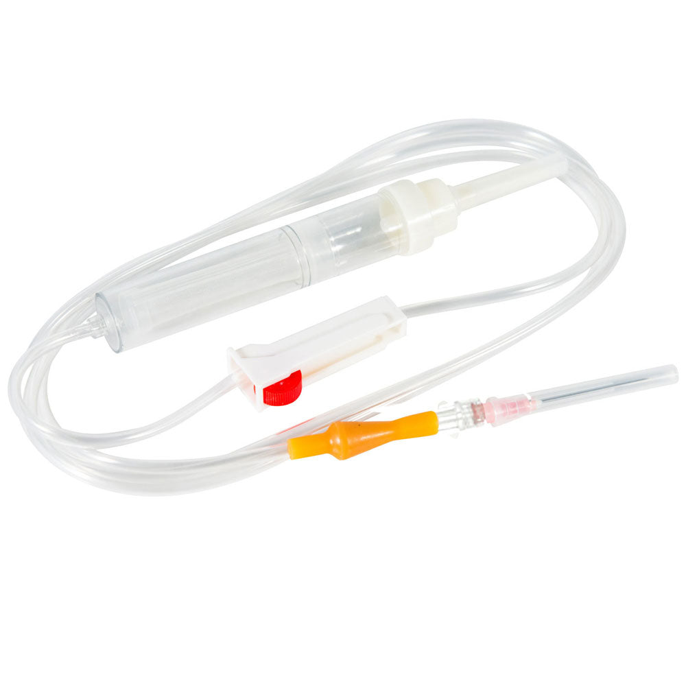 Transfuseur avec filtre pour poche souple et flacon filtre antibactérien et anti-particules.